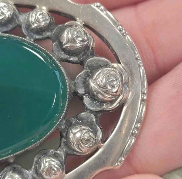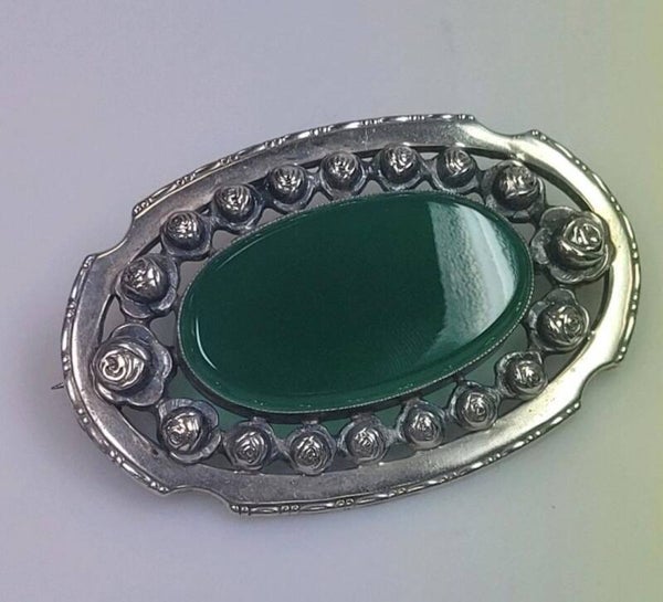 Antike jugendstil Brosche aus 800er silber und Chrysopras, Handarbeit um 1910.