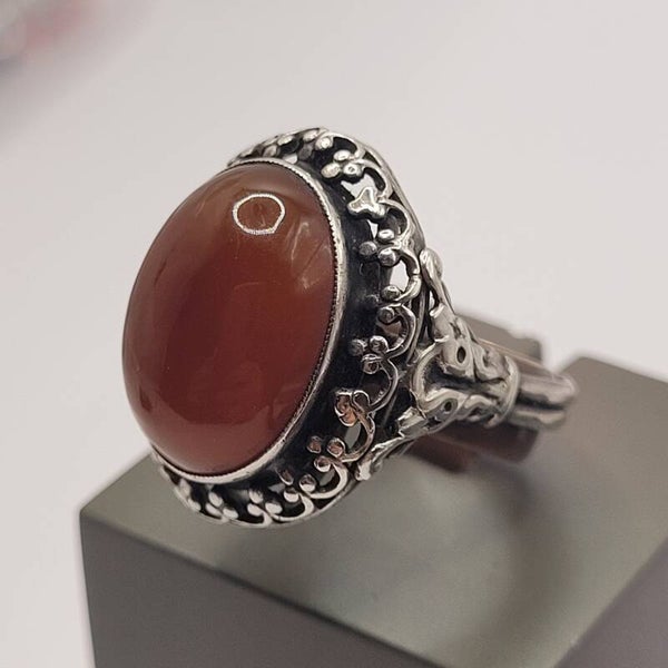 Toller antiker Jugendstil aus 835er Silber und großem glänzenden Karneol. Die Fassung des Edelsteins wurde sehr detailliert ausgearbeitet. Sie ist mit geschwungenen Ornamenten verziert.
