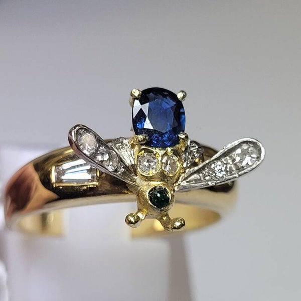 Prachtvoller Jugendstil Ring aus 750er Gelbgold mit Saphir,Smaragd und Diamanten um 1920. Der Ringkopf besteht aus einer plastisch ausgearbeiteten Fliege. Das Hinterteil besteht aus einem leuchtenden ovalen echten Saphir. Der Korpus sowie die Flügel sind mit Diamanten im Altschliff verziert. Der Kopf ist mit einem Smaragd Cabochon veredelt. Die Flügel des Insekts sind in Weißgold gehalten.