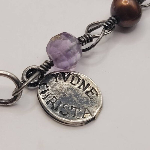 Ausgefallenes Designer Armband von Yvone Christa New York. Das Armband ist aus 925er Silber gefertigt und besteht aus Blüten und mehreren Abhängungen, die geschliffene Edelsteine (Granat, Amethyst) oder echt Perlen an sich befestigt tragen. Jedes Stück von Yvone Christa wird hangefertigt.