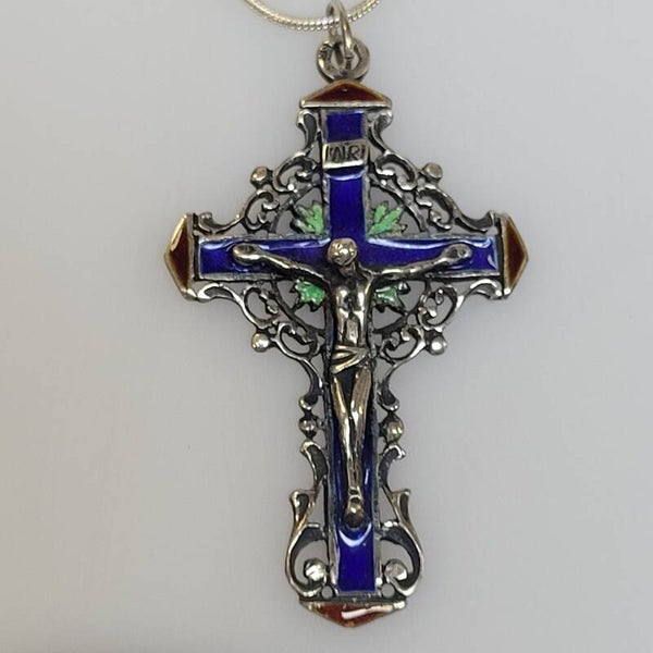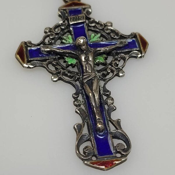Antikes russisches Jugendstil Kreuz aus 875er Silber, Handarbeit um 1910. Das Kreuz wurde fein und detailliert ausgearbeitet. Die Jesus Darstellung wirkt sehr plastisch. Auch leichte Gesichtszüge sind zu erkennen.  Weiterhin wurde farbliche Glänzenden Emaille eingearbeitet. Auf der Öse befindet sich die russische Silberpunze 84 für einen Feingehalt von 875er Silber.