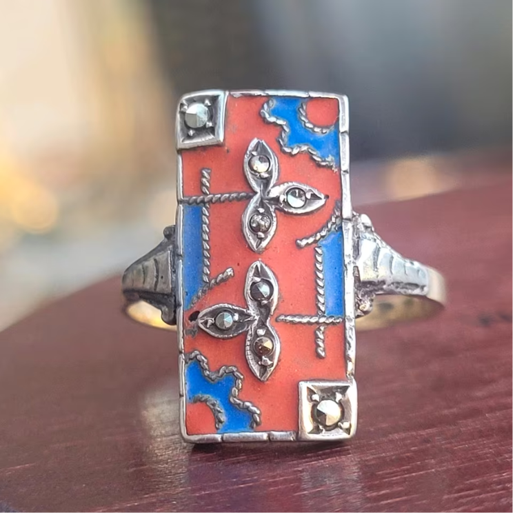 ❤ Antiker Art Deco Ring aus 585er Gelbgold und Emaille um 1920