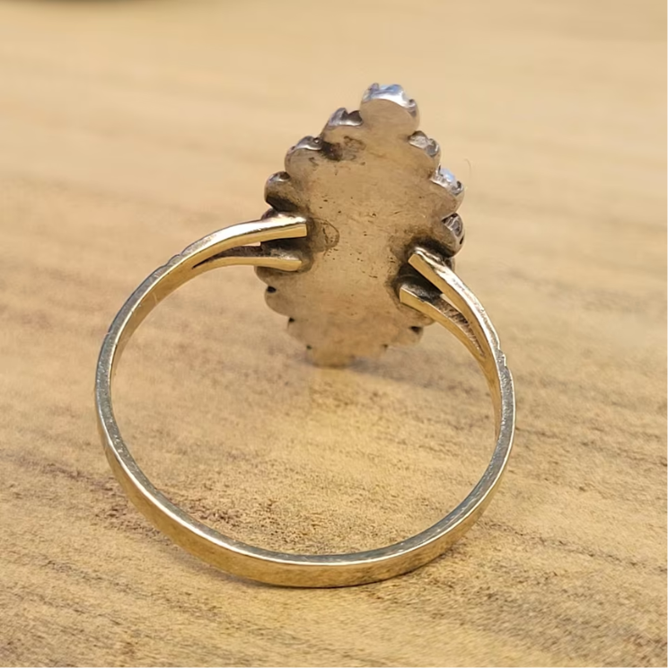 Dieser Ring trägt die Aura vergangener Zeiten, er erzählt Geschichten von Romantik, Eleganz und Beständigkeit. Ein Juwel für alle, die nicht nur Schmuck, sondern Gefühl und Geschichte tragen möchten.