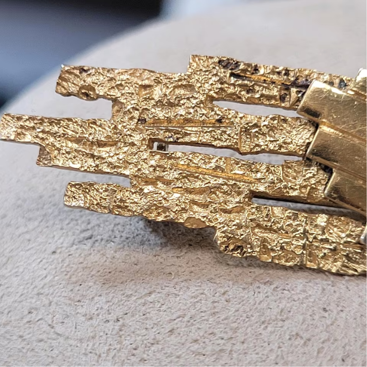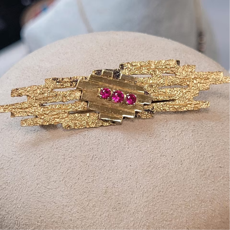 Die Brosche ist ein beeindruckendes Schmuckstück, das den brutalistischen Stil der 70er Jahre perfekt widerspiegelt: kantig, skulptural und zugleich elegant. Die Vergoldung verleiht dem geometrischen Design eine warme Ausstrahlung, während die drei Rubine einen edlen Farbakzent setzen.