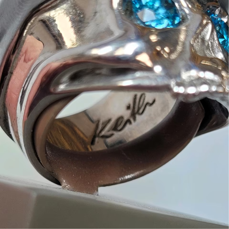 Exklusiver Totenkopfring von Sakia Dattner, der massive hochglanz polierte Totenkopf Ring Keith ist aus hochwertigem 925er Silber gefertigt, 2 leuchtenden blau topase dienen als Augen, zusammen ca 1,20ct.
