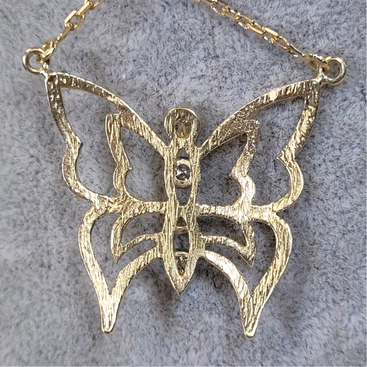 Außergewöhnliches Collier aus 750er Gelbgold und feurigen Brillanten. Der Anhänger wurde in Form eines Schmetterlings gearbeitet. Ein wirklich schönes und verspieltes Design. Seine Oberfläche wurde mit 4 Brillanten besetzt, welche stufenweise kleiner werden (0,20 ct / 0,15 ct. / 0,15 ct. / 0,10 ct.) Insgesamt sind es ca. 0,60 ct. (VVS1-VS1 G-H).