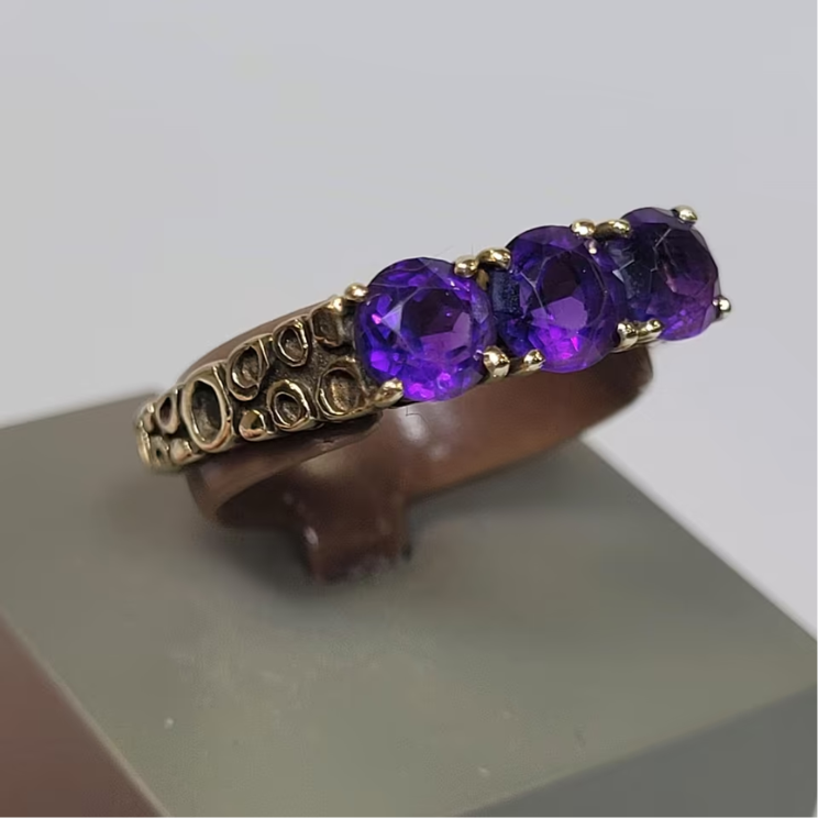 Der Fokus des Ringkopfes liegt definitiv auf den 3 intensiven Amethysten, welche ganz für sich wirken. Ihre Farben variieren je nach Lichteinfall zwischen Violett, blau und pink.