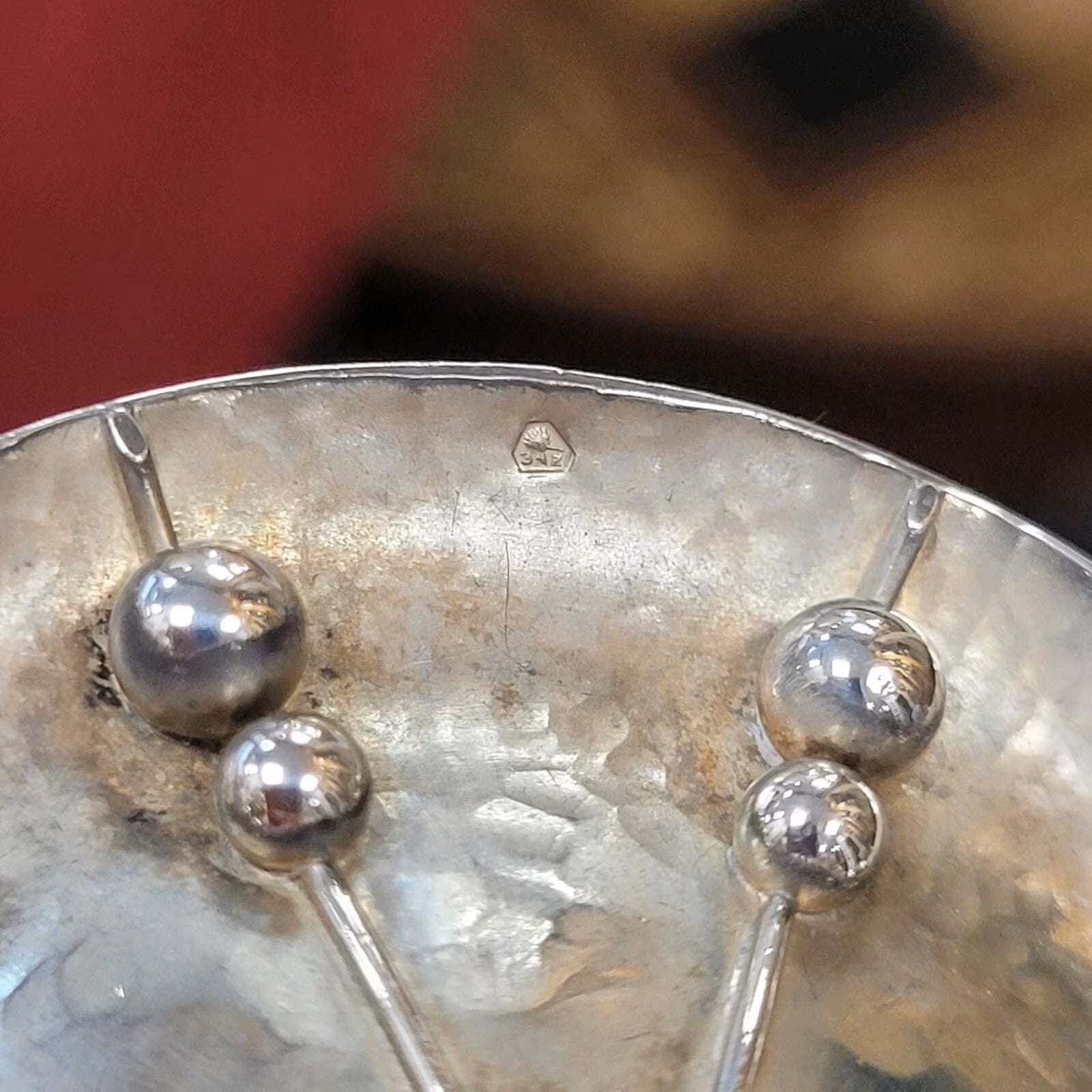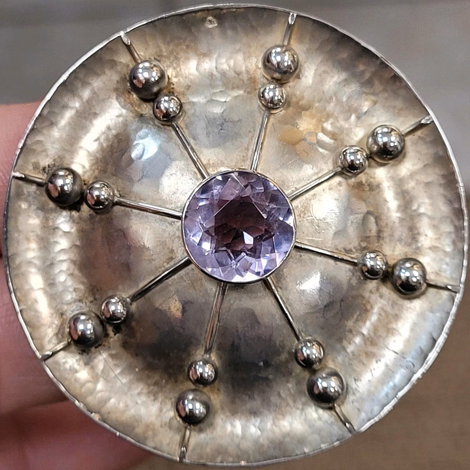 Die Brosche wurde rund gestaltet. Die Oberfläche wurde gehämmert und weist somit eine tolle Struktur auf. Die symmetrisch angeordneten Stäbe mit Kügelchen, runden das Bild ab. Mittig prunkt ein intensiver Amethyst.