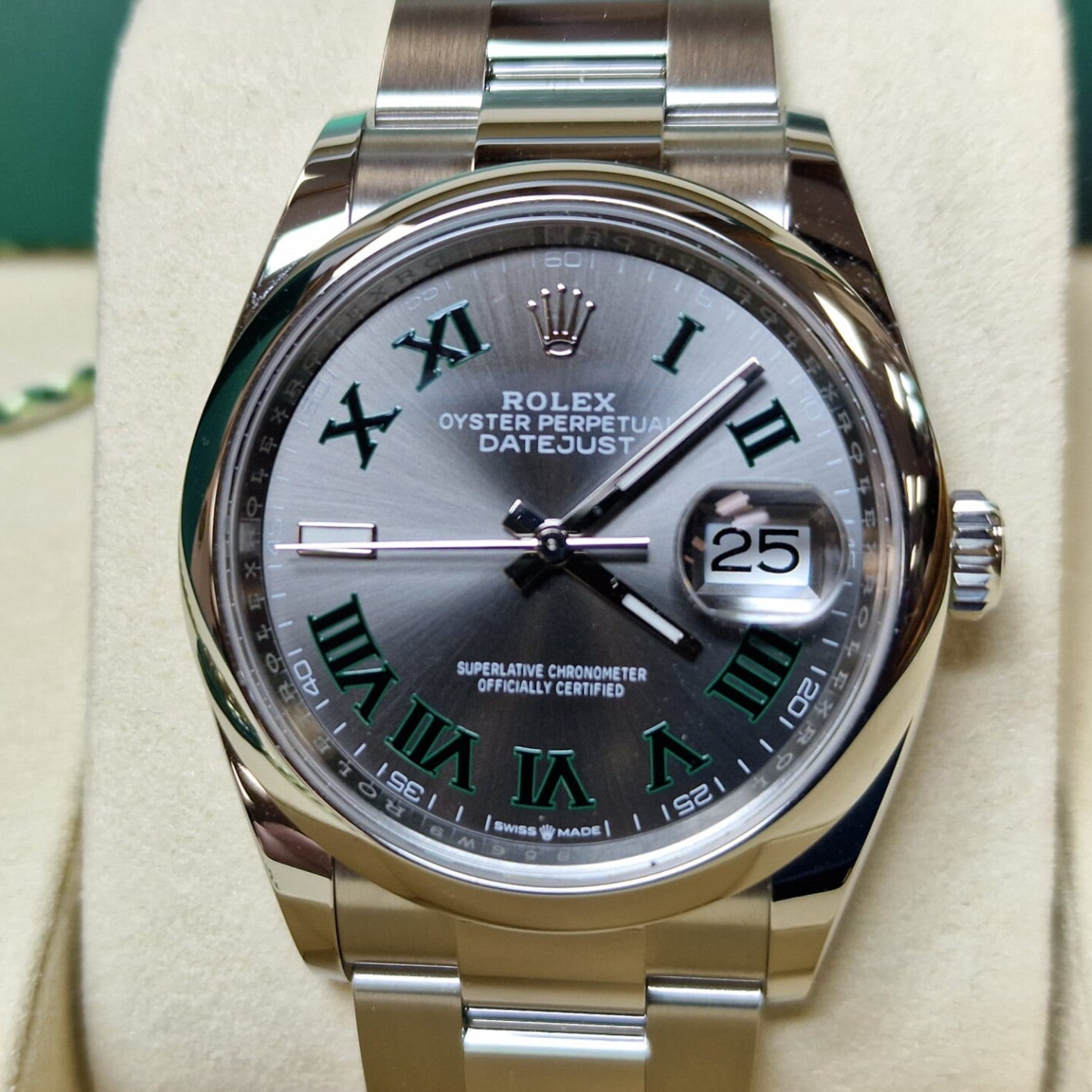 Zum Verkauf steht eine Rolex Oyster Perpetual Datejust 36 „Wimbledon“ in Edelstahl mit dem begehrten Rhodium-Zifferblatt und grünen römischen Ziffern – eine vergleichsweise seltene und sehr gefragte Konfiguration.