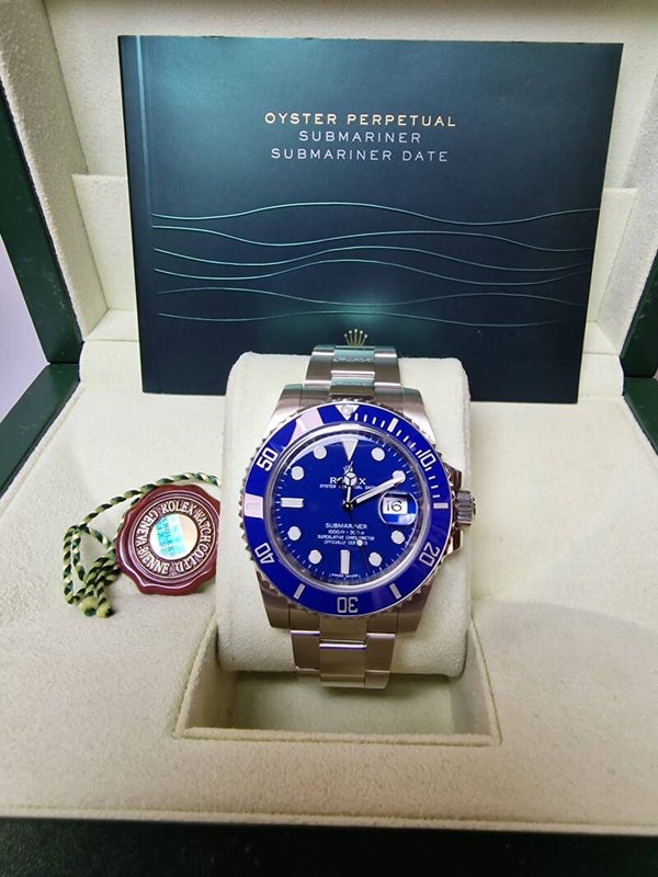 Zum Verkauf steht eine Rolex Oyster Perpetual Submariner Date aus 18 Karat Weißgold mit blauem Zifferblatt und blauer Cerachrom-Lünette – besser bekannt unter dem Sammlernamen „Smurf“.